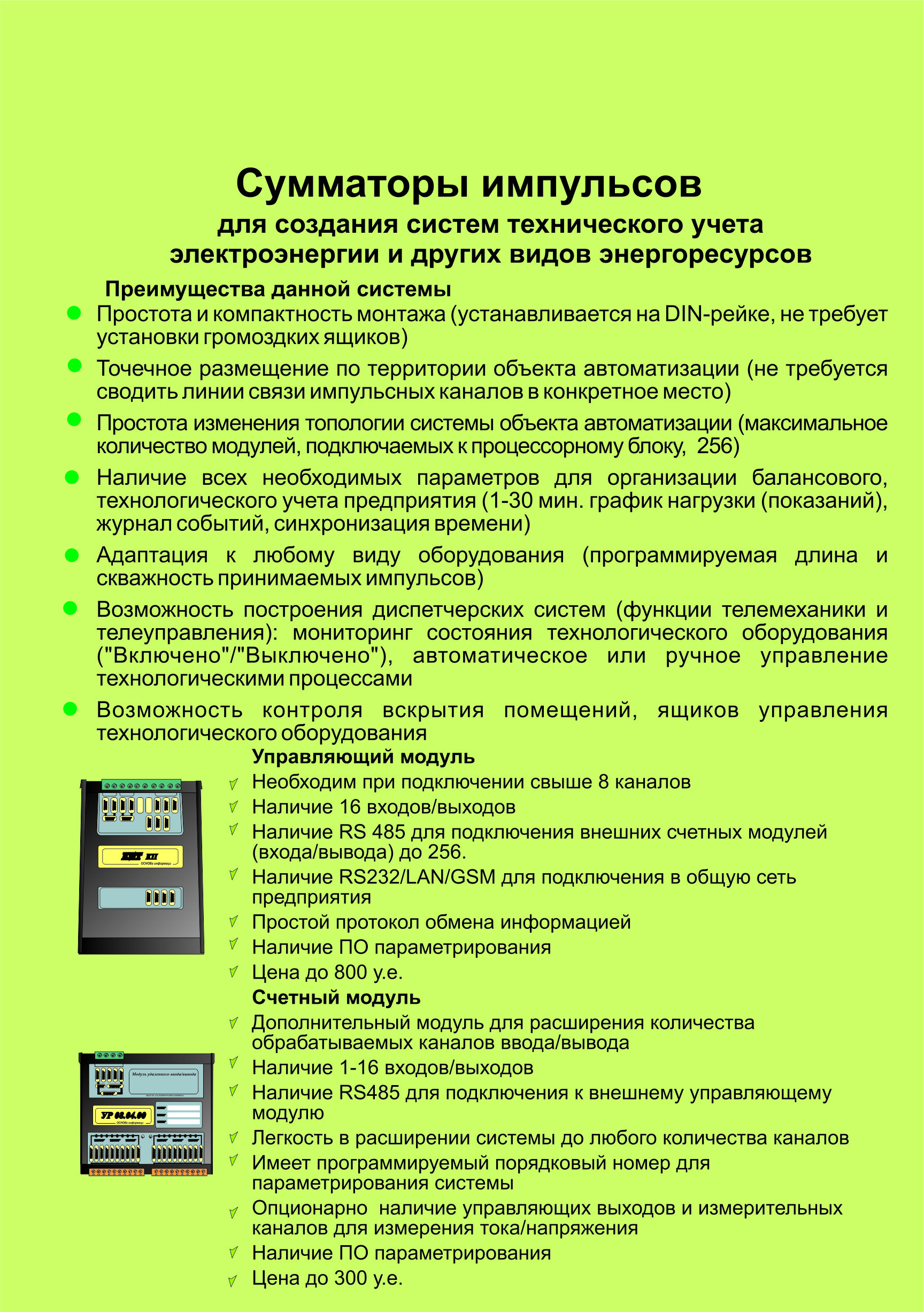 Мы предлагаем решения для технического учета энергоресурсов на базе суматоров импульсов компании НПФ "Энергия". Данное решение отличается компактностью и ценовой политикой. На данный момент реализовано два обьекта с общим количеством точек учета - 350. ![]() |